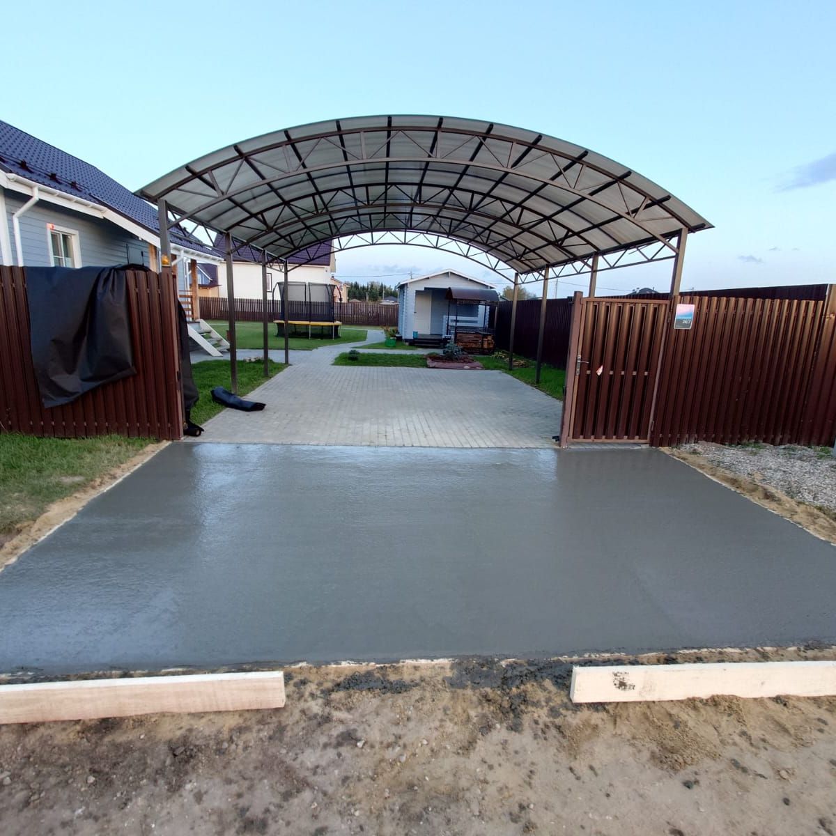 Мы берём на себя полный цикл: от организации съезда с дороги и прокладки дренажных труб до устройства основания, укладки финишного покрытия и монтажа навеса.